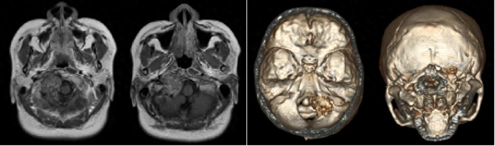 因为小兰的肿瘤位于颅底、位置较深已经严重破坏了枕髁区的骨质,与供应脑干的血管边界不清术中将面临肿瘤切除困难、颅神经损伤、椎动脉破裂大出血以及颈枕部不稳定等多重困难北京地坛医院神经外科主任冯恩山接诊了小兰,多年的临床经验提醒他这是一块硬骨头、风险极高,需要神经外科脑肿瘤、血管介入及脊髓脊柱等亚专业的通力合作。