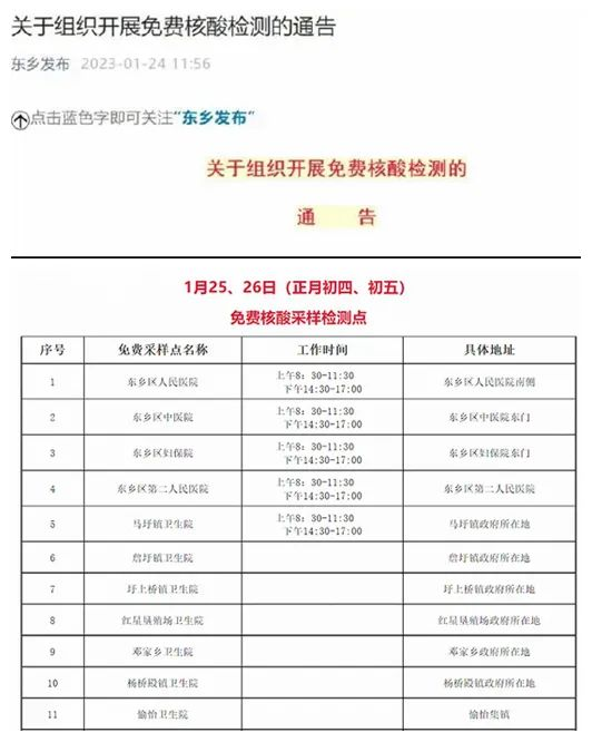 当日上午11时56分,“东乡发布”发布通知,决定于1月25和26日连续两天在全区范围内开展单人单管免费核酸检测,公告还介绍了具体的核酸检测点和核酸采集注意事项。