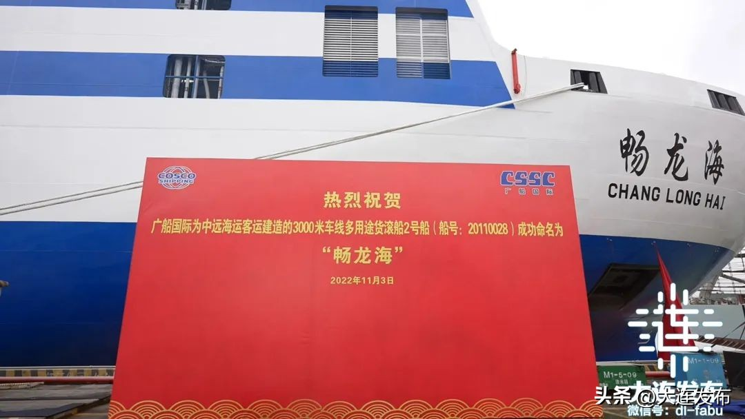 烟大航线将再添一艘多用途货滚船11月3日中远海运客运有限公司第二艘3000米车线多用途货滚船命名仪式在中国船舶集团广船国际造船码头举行